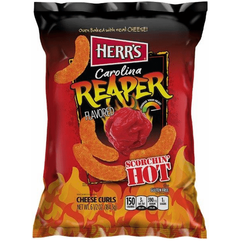 Turn up the heat with Herr's Carolina Reaper Cheese Curls! These crunchy curls deliver a fiery kick from the world’s hottest pepper, balanced with cheesy goodness for a snack that’s both bold and addictive. Perfect for spice lovers ready to ignite their taste buds with every bite. Grab a 113g bag and dare to snack differently!